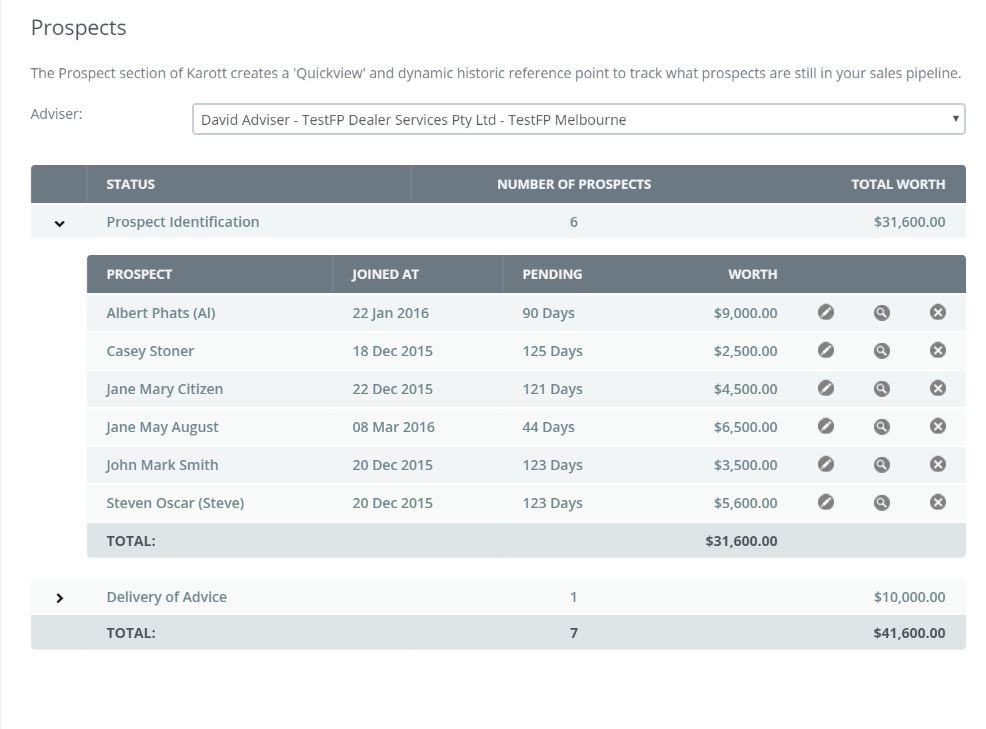 This Tab allows both the Compliance, Practice Manager, Adviser, BDM, Support staff to view the pipeline and position of all the prospects within that Adviser practice.