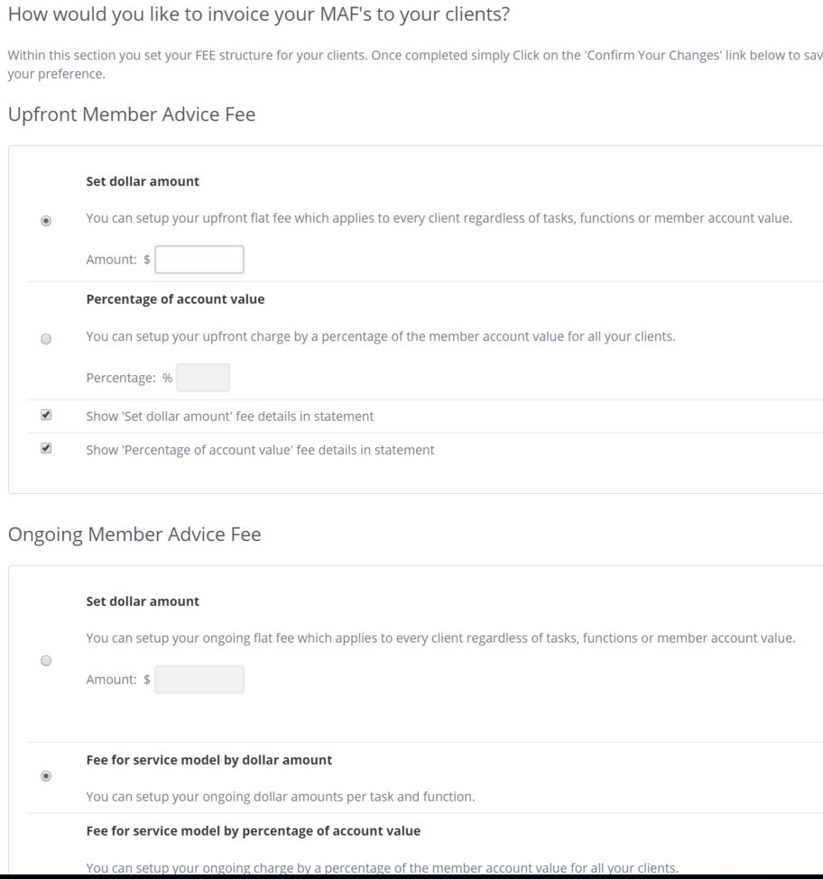 Moving to the next screen you have the ability to set-up your fees and outcomes for your MAF (Member Advice Fee)