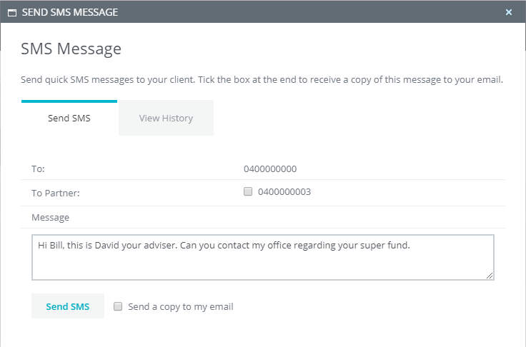You also have the option to view the instant history of SMS prior to sending your SMS, this allows you to personally track and manage your communication with your client