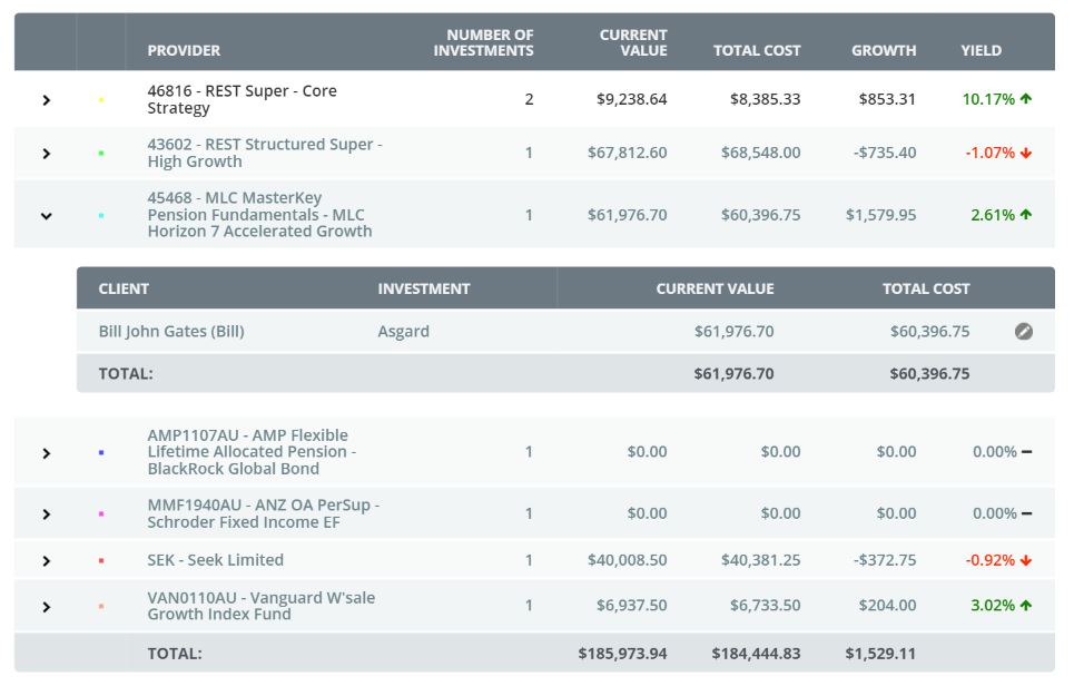 Above you can see from the above screen shot, simply by clicking on the arrow tabs you can continue to drill down all the way to the client level and into the clients active file.