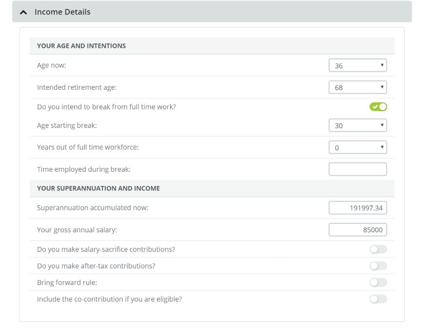 Each field is completely editable recalling important data from your clients file, like age, intended retirement age, salary and super fund overall balance.