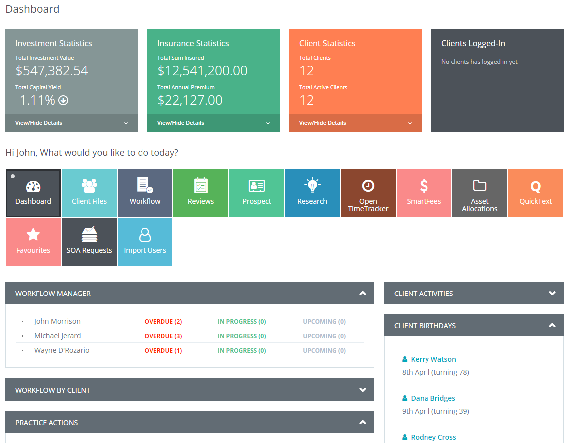 Next, within the centre section of your Dashboard are up to 13 active ‘Hot Button” options for you to use in planning and designing your practice advice position. For example, if you click on the "Workflow" button you will see ALL the open workflow tasks for your practice by client name, these are colour coded to easily identify tasks that are overdue, in progress and upcoming.
